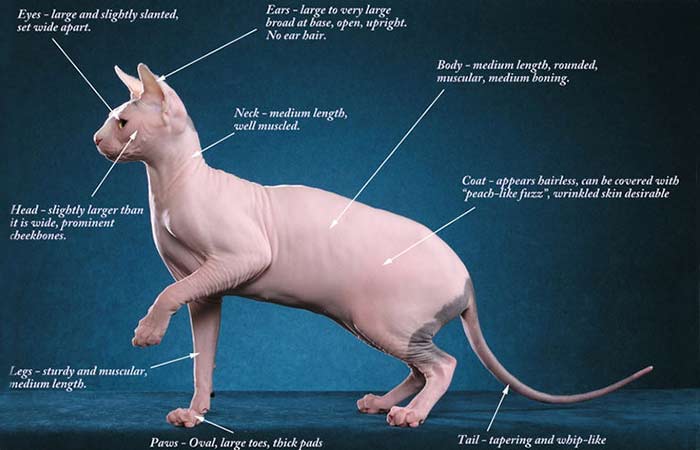 Sphynx cats are covered with a thin layer of fleece that is not easily perceived by the naked eye. In different environmental temperatures, the density, length, presence or absence of fleece on the hairless body will change. To the touch, the skin of the hairless cat feels more like a small suede and is very soft and gentle. Another characteristic of hairless cats is the folds on the skin. There are layers of folds around the shoulders, between the ears, on the sides of the cheeks, and at the bend of the front and back legs.