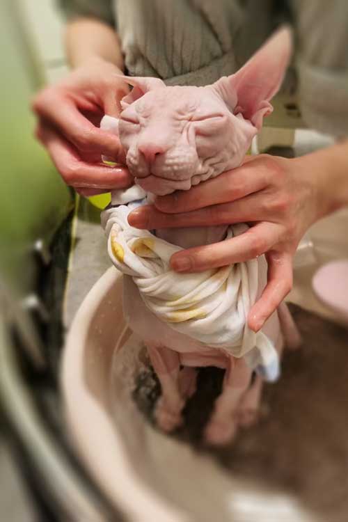 Hairless is one of the few cat breeds that are very receptive to water (bathing). Most hairless can stay in a relaxed state in the bath and slightly tense in the shower due to the sound of the water, but can also accept and relax very quickly.